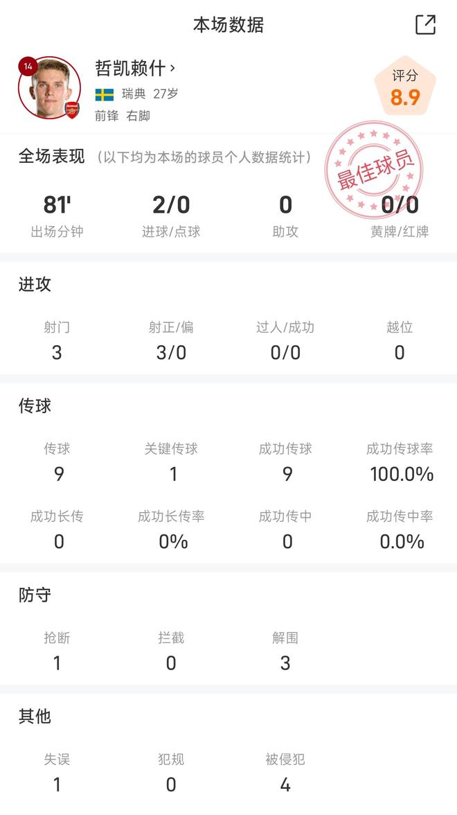 雷速體育10月22日訊 在今天凌晨結(jié)束的阿森納主場4-0馬競的歐冠比賽中,哲凱賴什梅開二度。
